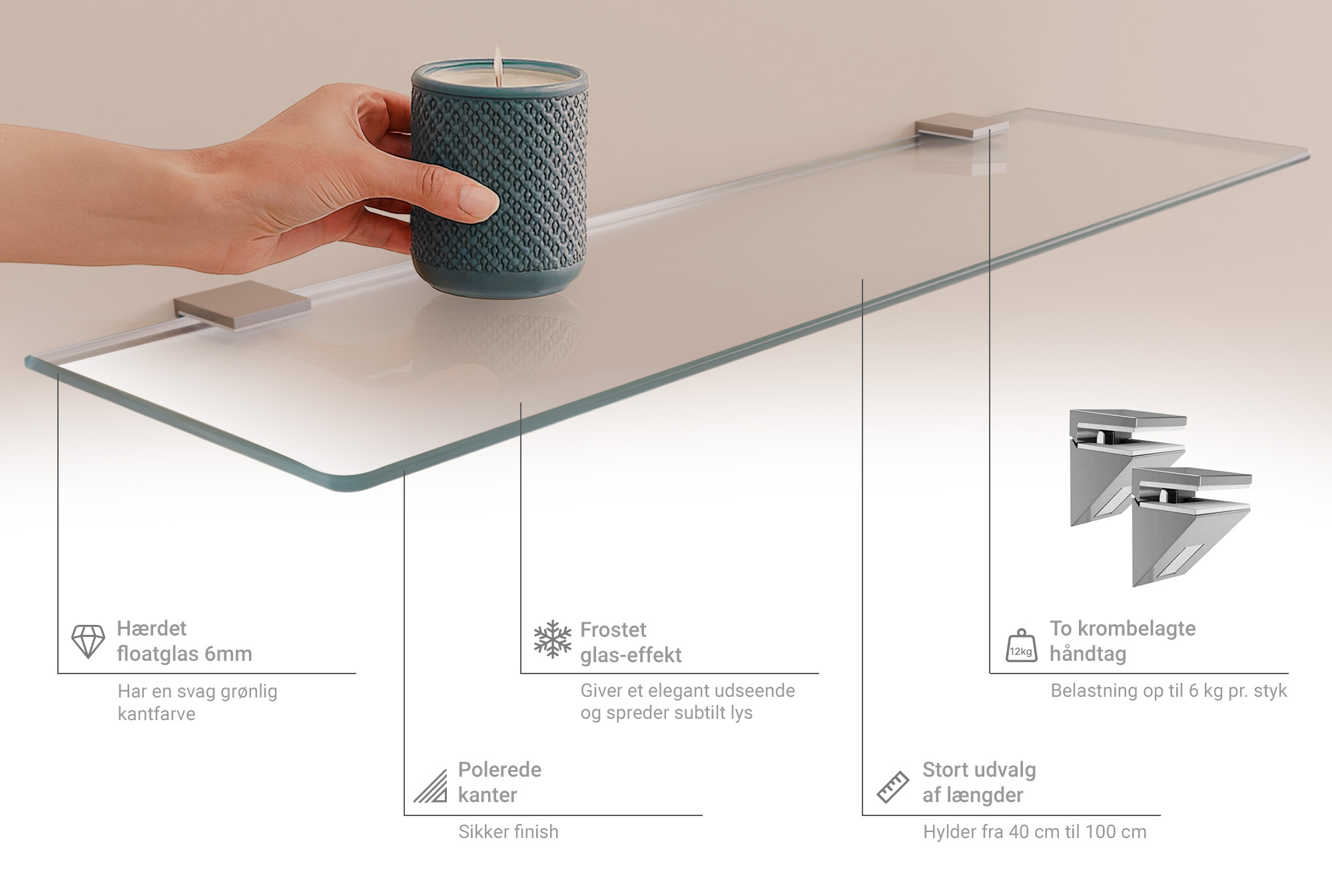 - Glastykkelse: Med 6 mm glas får du en balanceret kombination af slankhed og stabilitet, der passer til moderne designglashylder.